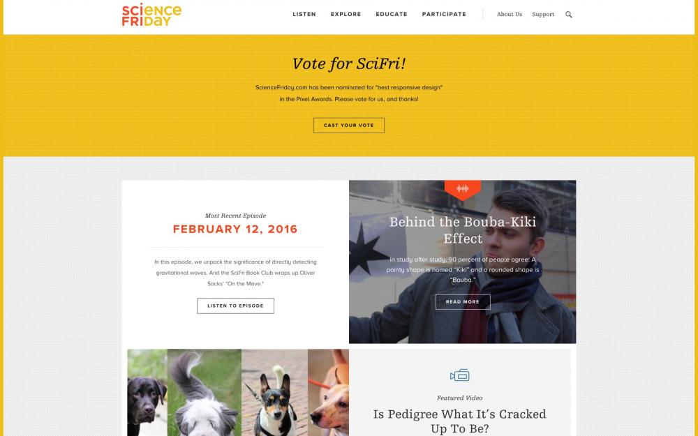 Bluecadet tarafından Philadelphia’da geliştirilen Science Friday internet sitesi, bilim ve teknoloji dünyasındaki gelişmeleri radyo yayınları, video içerikler ve farklı formatlarla eğlenceli ve eğitici şekilde aktarıyor.