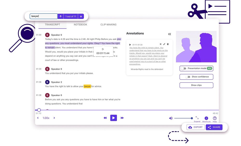 Ceza davalarının yüzde 80’inden fazlası video kanıtlarını içermesine rağmen avukatların büyük bir çoğunluğu delil içeren görüntüleri incelemek için zaman bulmakta zorluk çekiyor. Hapishane kayıtlarının, röportajların ve diğer kamera görüntülerinin referans olabilecek noktalarını kelimeleri ya da cümleleri saptayarak çıkarabilen JusticeText bu alanda yüzde 30 ile 50 arasında zaman tasarrufu sağlıyor. Dokümanlara yapılan açıklamalar ve video oluşturma seçenekleri jüri duruşmalarında ve sözlü ifadeler sırasında kullanışlı olabilecek bir çözüm sunuyor.