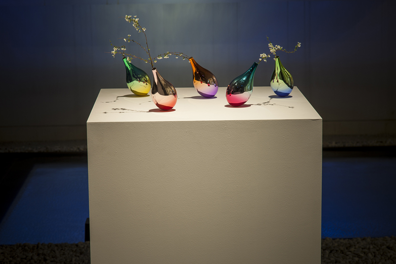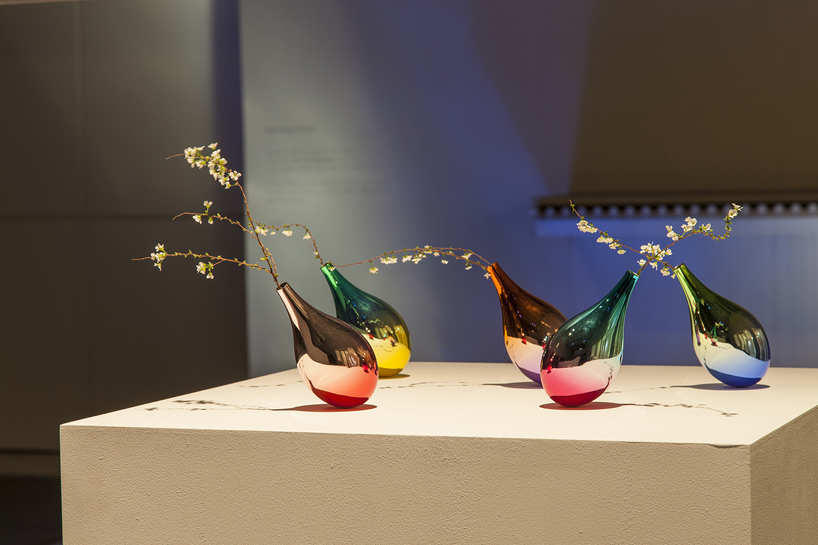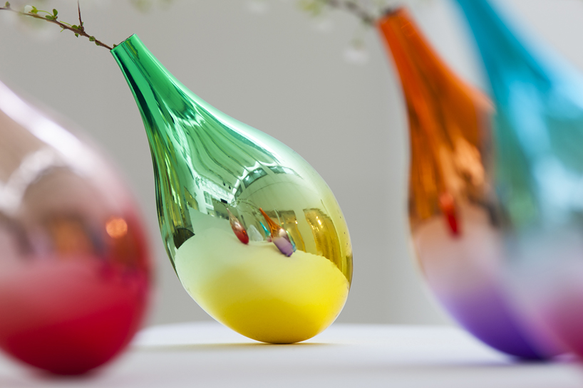 Damla formundaki, yuvarlak tabanlı vazolar, içlerine yerleştirilen ağırlıklar sayesinde ayakta duruyor. Çelikten yapılan vazoların farklı renk çeşitleri var ve her biri farklı renk kombinasyonlarını içinde barındıran aynalı bir dış yüzeye sahip.