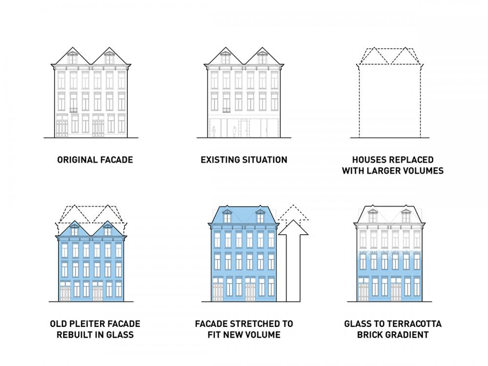 Amsterdam’ın lüks mağazalarla bezeli meşhur alışveriş caddesi PC Hooftstraat üzerinde yer alan bir mağaza için gerçekleştirilen cephe tasarımında cam, taşıyıcı bir yapı malzemesi olarak ele alındı. Caddenin geleneksel mimari diline uyum sağlayacak biçimde cam, alışılagelen cephe malzemesi terakotanın yerini aldı.