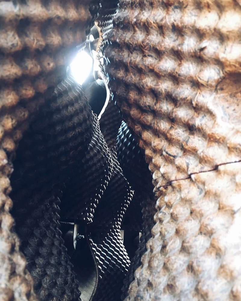 Willow Technologies’in kurucusu Mae-ling Lokko, sağlıklı bir tasarım modelinin uygulanabilirliğini ispatlayan önemli girişimcilerden. Lokko, dha sonradan tarımsal atık malzemeleri üst düzey akustik uygulamalar için kullanacak olan AMBIS Technology adlı bir şirket daha kurmuş. Şirket, 2016’da Akra’daki Chalewote Sokak Sanatı Festivali’nde AMBIS Hindistan Cevizi Duvarını sergileyerek oldukça dikkat çekmiş. Bu festivalden paylaşımları aşağıda görebilirsiniz. Mae-Ling Lokko’nun ileri dönüşüm pavyonu adını verdiği bu paneller, hindistan cevizi kabuğuna ek olarak başka malzemeler de içeriyor. Kakao ihracat endüstrisinde kullanılan geri dönüştürülmüş çuval bezleri üzerine, e2e Materials şirketi tarafından preslenmiş hindistan cevizi kabuğu lifleri ve soya bağlayıcılar eklenmiş. Kioskun inşasında ayrıca, petrol varillerinden elde edilen plastik atıklardan ve popüler bir yerel şirket olan Trashy Bags’in reklam panolarından geri dönüştürülen atıklardan yapılan malzemeler de kullanılmış.