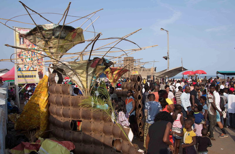 Willow Technologies’in kurucusu Mae-ling Lokko, sağlıklı bir tasarım modelinin uygulanabilirliğini ispatlayan önemli girişimcilerden. Lokko, dha sonradan tarımsal atık malzemeleri üst düzey akustik uygulamalar için kullanacak olan AMBIS Technology adlı bir şirket daha kurmuş. Şirket, 2016’da Akra’daki Chalewote Sokak Sanatı Festivali’nde AMBIS Hindistan Cevizi Duvarını sergileyerek oldukça dikkat çekmiş. Bu festivalden paylaşımları aşağıda görebilirsiniz. Mae-Ling Lokko’nun ileri dönüşüm pavyonu adını verdiği bu paneller, hindistan cevizi kabuğuna ek olarak başka malzemeler de içeriyor. Kakao ihracat endüstrisinde kullanılan geri dönüştürülmüş çuval bezleri üzerine, e2e Materials şirketi tarafından preslenmiş hindistan cevizi kabuğu lifleri ve soya bağlayıcılar eklenmiş. Kioskun inşasında ayrıca, petrol varillerinden elde edilen plastik atıklardan ve popüler bir yerel şirket olan Trashy Bags’in reklam panolarından geri dönüştürülen atıklardan yapılan malzemeler de kullanılmış.