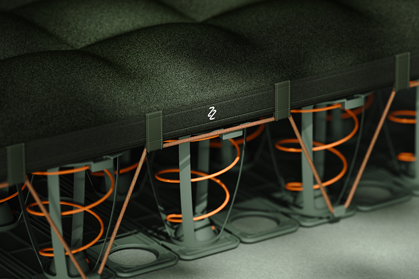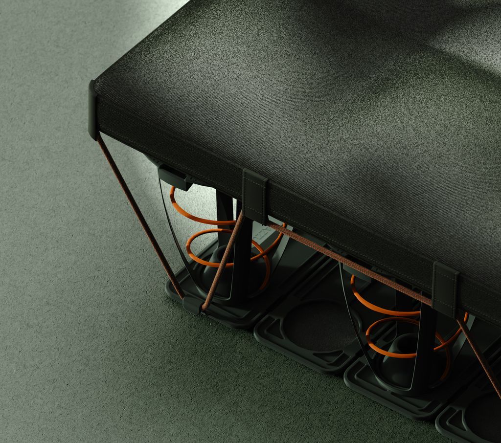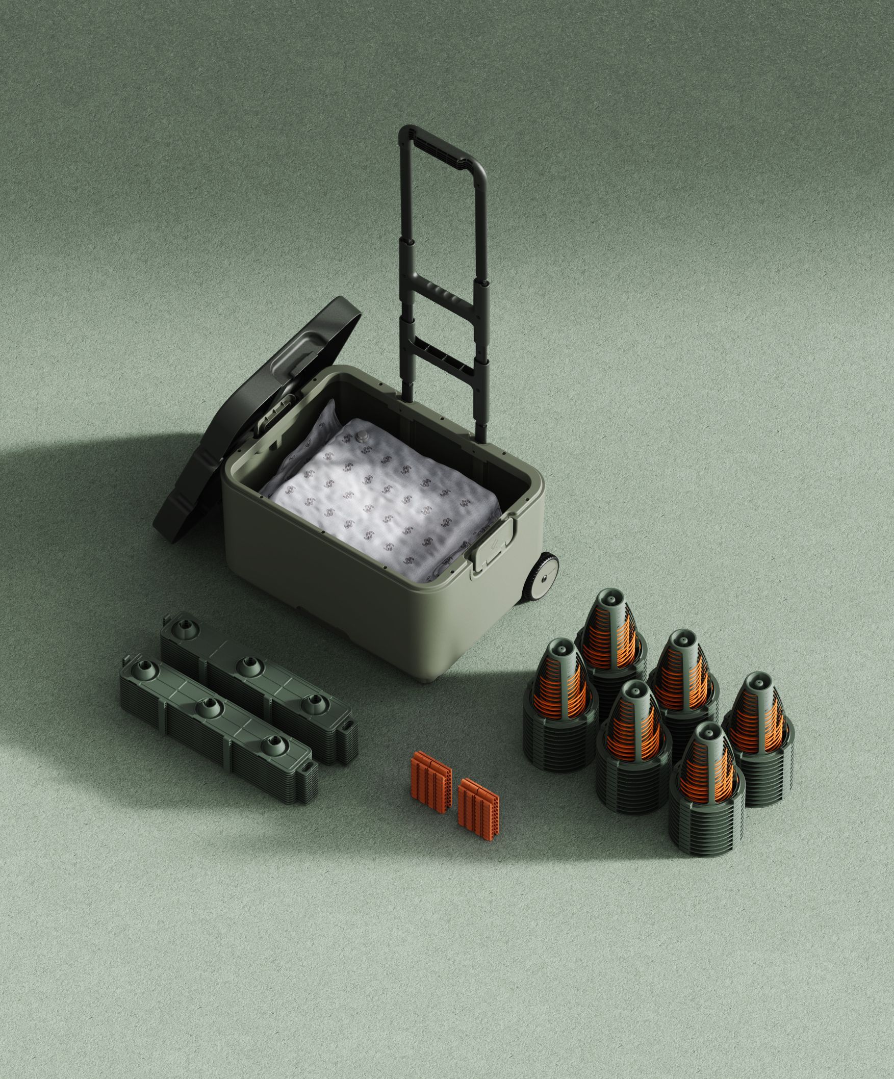 Taşınabilirlik açısından da dikkat çeken ürün, kule şeklindeki yayların iç içe geçmesiyle oldukça küçük bir hacme indirgenebiliyor. Tüm yatak sistemi (katlanabilir taban, yay modülleri ve üst katman) bir kamp soğutucusu boyutunda olan tekerlekli bir çantaya sığıyor. Bu çanta, kamp alanında sehpa veya depolama kutusu olarak da kullanılabiliyor.