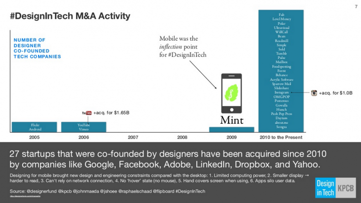 Tasarımcı olmak sadece logo ve görsel hazırlamak değil disiplinin temelleriyle şirket yönetimi, kullanıcı ilişkileri, arayüz tasarımı gibi birçok alanda markaların benzerlerinden sıyrılmasını sağlayan bir değer. Tasarımcıların aktif rol aldığı girişimleri görmek için her gün kullandığımız ağları ve internet sitelerini örnek verebiliriz. 2006 yılında Google, Youtube’u satın alması; tasarımcı faktörünün büyük şirketlere karşı yarattığı değerin ilk örneği. 2010’dan bu yana ise Beats, Tumblr, Instagram, Behance gibi 27 girişim Facebook, Google, Yahoo, Dropbox, Adobe gibi dev şirketler tarafından satın alındı.