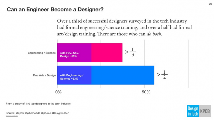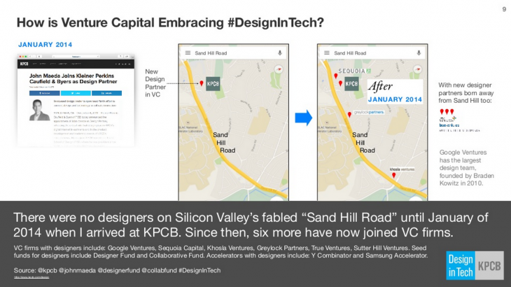 Farklı disiplinlerin bir araya gelmesiyle yaratılan girişimler, Silikon Vadisini de etkiliyor. John Maeda Ocak 2014’te Kleiner Perkins’e katıldığı zaman ofislerinin bulunduğu Sand Hill Road’da yönetici pozisyonundaki tek tasarımcı kendisiydi. Fakat bunu takip eden 6 ay içerisinde bu sayı 6 tasarımcı daha risk sermeyedarı şirketlerde yönetici olarak çalışmaya başladı.