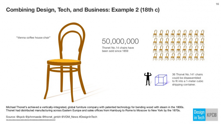 Oturumun ikinci tartışma başlığı olan tasarım, teknoloji ve şirket ekseni için Maeda’nın verdiği ilk örnek, klişe olduğunu bilip dile getirse de Apple ürünleri oldu. Macbook’un kasasının alüminyum kalıbın kesimi ve üretimi için kullandığı lazer kesim, bu üçlünün birleşimiyle yaratılabilecek farklılığın ilk örneklerinden birisi. İkinci örneği ise gördüğümüzde normal ahşap sandalye diyeceğimiz Michael Thonet’in tasarımı. Üst üste koyarak iç içe geçen sandalyeler, lojistik konusunda bir devrim niteliğindedir. Bu sayede 1870’lerden beri 36 sandalyeyi 1 metreküp hacmindeki kutulara koyarak Avrupa’ya ve Amerika’ya gönderimini sağladı.