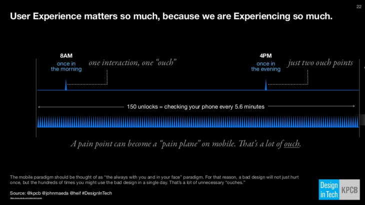 Kullanıcı deneyimini bu denklemde incelediğimizde deneyimleme süremize göre bir oran kurabiliriz. Maeda, kullanıcı deneyimiyle karşılaştığımız anı teknolojiye şaşırma anı olarak tanımlıyor. Masaüstü bilgisayarlar kullanırken sabah işe gitmeden önce ve akşam eve geldiğimizde, günde iki kez şaşırıyorken mobil devrimden sonra günde 150 kez şaşırıyoruz.