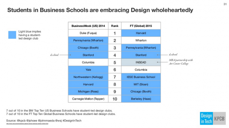 Ticaret ve işletme hakkında yetkin okulların tasarım alanındaki etkinliği de artan trendler arasında yer alıyor. Amerika Birleşik Devletleri ve küresel çapta önde gelen 10 üniversitenin 7’sinde tasarım kulübü bulunuyor. Girişimci, tasarımcı, yazılımcı yetiştiren bu okulların öğrencileri farklı disiplinlerle çalışmayı eğitim sırasında gözlemleyerek arka arkaya ünvan yazabilir hale geliyor.