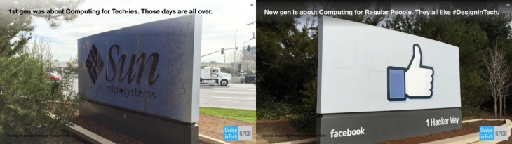 1982 yılında Silikon Vadisinde kurulan Sun Microsystems’ın şirket binasının önündeki logosu ve iletişim dili sadece bilgisayar ve yazılımla ilgilenen kişilerin teknolojiye vakıf olabileceğini söylüyordu. Fakat Facebook ofisinin önünde yer alan panoda ise tasarımın ve tasarımcının önemini ortaya koyuyordu. Teknoloji sadece bilgisayarla ilgilenen kişi için olmaktan çıkıp herkesin ilgi alanına giren bir endüstri haline gelmişti.