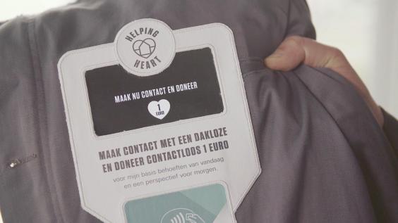 “Helping Heart” yani “Yardım eden kalp” ya da daha güzel bir Türkçeyle “Kalpten Bir Yardım” diyebileceğimiz mont; sıradan bir parka görünümünde. Ancak, kalbin olduğu kısım üzerine iliştirilmiş bir kart okuyucu var. İnsanlar temassız kartlarını buraya okuttuklarında o kişiye anında 1 euro’luk bir yardım yapmış oluyorlar. Montun LCD ekranı bağış tutarını gösterip teşekkür etmenin yanı sıra, kullanım talimatlarını da sürekli olarak oynatıyor. Temassız kart kullanımı ile yanınızda para olmaması sorunu çözülmüş oluyor.