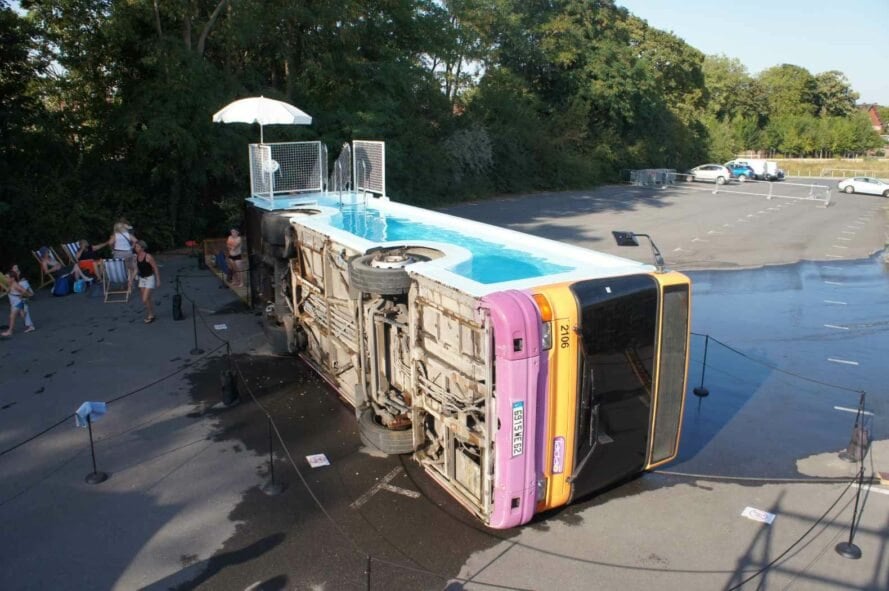 Benedetto Bufalino, geçtiğimiz yıllarda bir çimento karıştırıcıyı disko topuna, eski bir karavanı ise seyyar yüzme havuzuna dönüştürerek efsane işlere imza atmıştı. Kendine özgü mizah anlayışıyla dikkat çeken Fransız sanatçı şimdi de emektar bir şehir hatları otobüsünü yan yatırarak The Bus Pool adını verdiği yüzme havuzuna dönüştürdü.