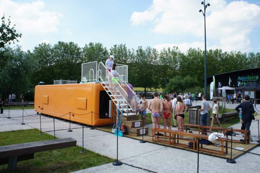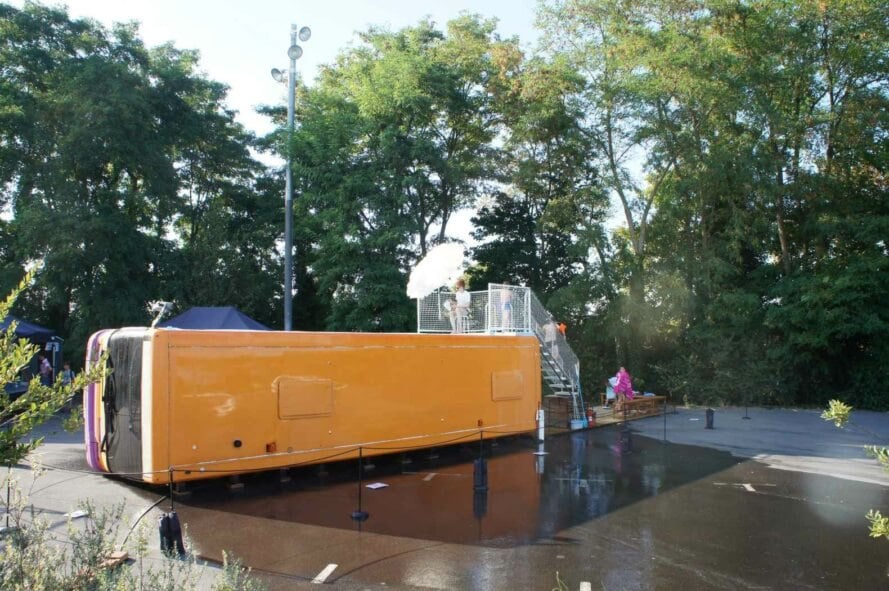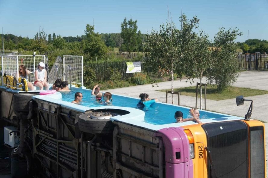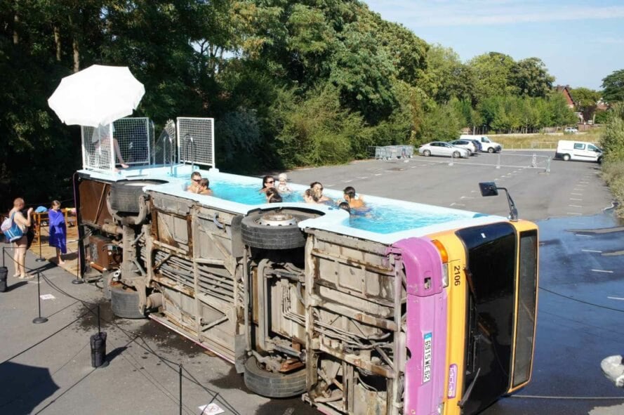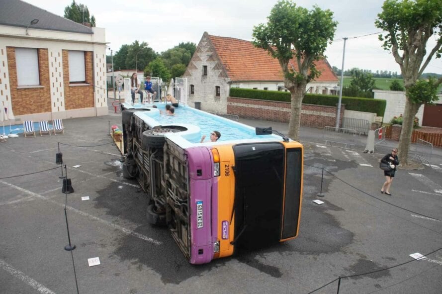 Benedetto Bufalino, geçtiğimiz yıllarda bir çimento karıştırıcıyı disko topuna, eski bir karavanı ise seyyar yüzme havuzuna dönüştürerek efsane işlere imza atmıştı. Kendine özgü mizah anlayışıyla dikkat çeken Fransız sanatçı şimdi de emektar bir şehir hatları otobüsünü yan yatırarak The Bus Pool adını verdiği yüzme havuzuna dönüştürdü.