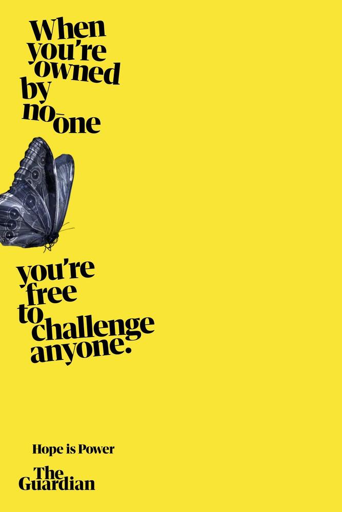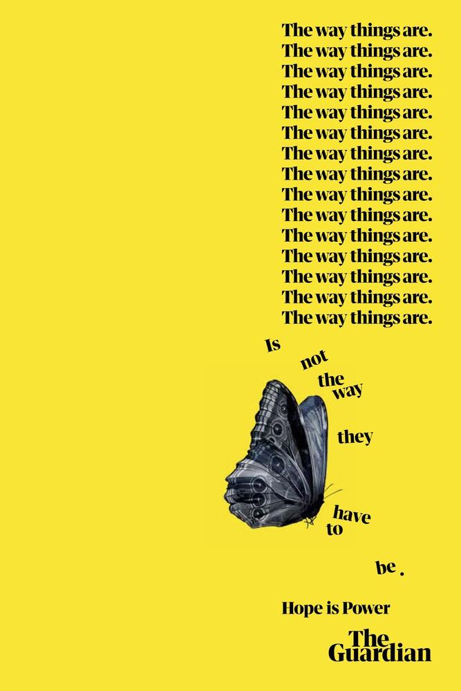 Uncommon Creative Studio tarafından kampanya umudun gücünü gösteriyor. “Hope is Power” isimli kampanya The Guardian’ın neredeyse 200 yıla yaklaşan geçmişinde benimsediği duyguyu eyleme dönüştürüyor. 2008 yapımı Oscar Ödüllü Thoery of Everything filminin yönetmeni James Marsh tarafından yönetilen film boş ve kasvetli bir odadan çıkmaya çalışan kelebeği merkezine alıyor.