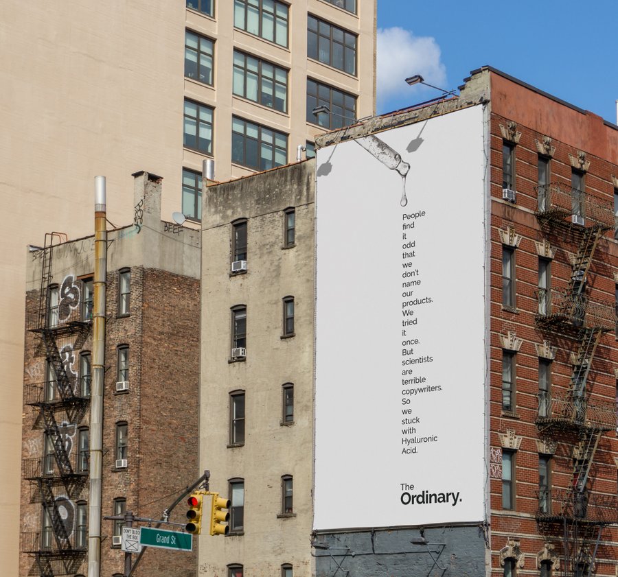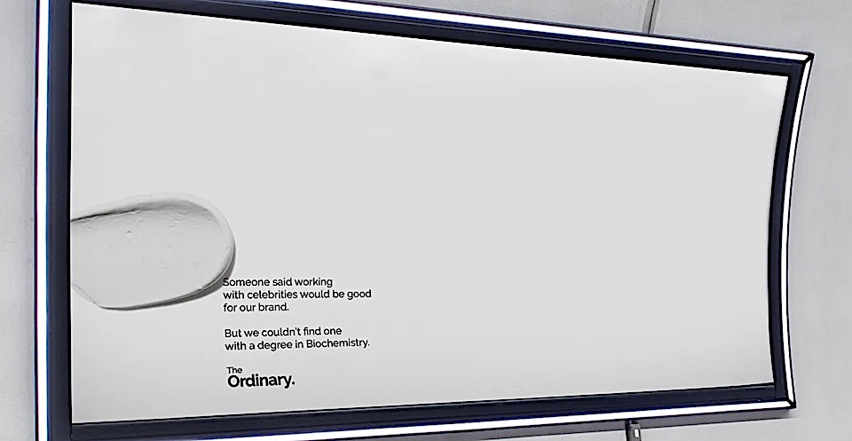 Marka kimliğinden ambalaj tasarımlarına kadar hemen her konuda minimalizm ve şeffaflıktan yana olan Kanada merkezli cilt bakım ürünleri markası The Ordinary, yeni açık hava reklam kampanyasıyla da güzellik ve bakım sektöründe hakim olan görsel dile adeta meydan okuyor. Merkezinde kelimelerin ve ustaca bir yaratıcı yazarlığın bulunduğu kampanyada The Ordinary, bir yandan güzellik ve bakım sektörünün kullandığı pazarlama klişelerini sarkastik bir dille ele alırken bir yandan da işin ardındaki ‘gerçek’lerden bahsediyor.