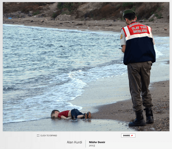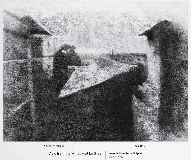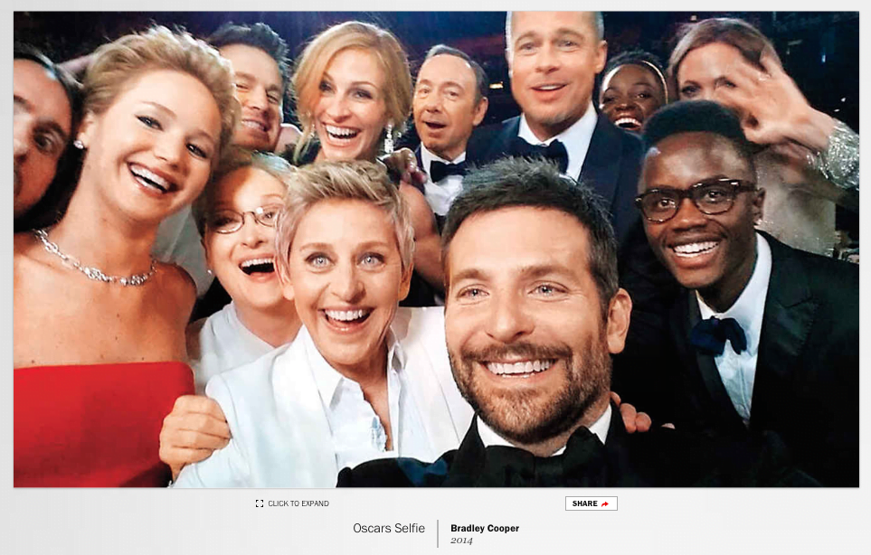 Koleksiyon, Fransız mucit Joseph Nicéphore Niépce’in 1826’da çektiği düşünülen ve tarihteki ilk fotoğraf olarak bilinen View from the Window at Le Gras ile başlıyor. 2014 Oscar ödül töreninde çekilen Bradley Cooper selfie’si ve son olarak da 2015’te Bodrum’da kıyıya vurmuş cansız bedeniyle tüm dünyanın yüreğini sızlatan Alan Kurdi‘nin Doğan Haber Ajansı’ndan Nilüfer Demir tarafından çekilmiş fotoğrafıyla günümüze dokunuyor.