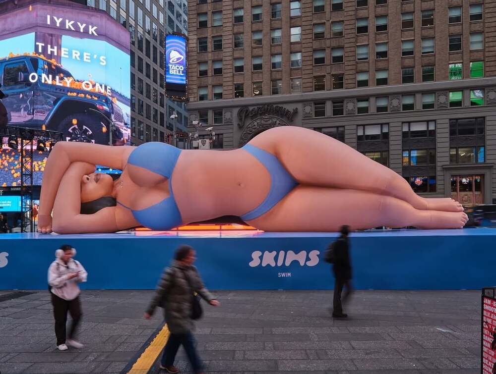 Yerleştirme, yaklaşık 18 metre uzunluğunda. Şişme Kardashian’a, yaklaşan mayo koleksiyonundan bir bikini giydirilmiş. Şişme figür, markanın logosunu içeren yaklaşık 1,3 metre yüksekliğindeki mavi bir kaidenin üzerinde uzanıyor. Kampanya, yaratıcı ajans Merry Wonderer‘dan Amy Kule tarafından yürütülüyor.