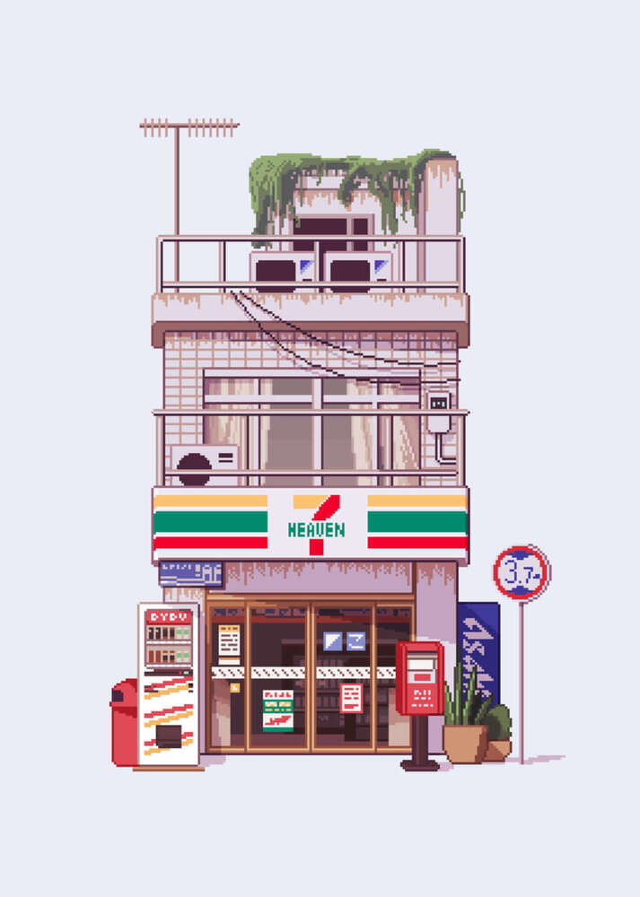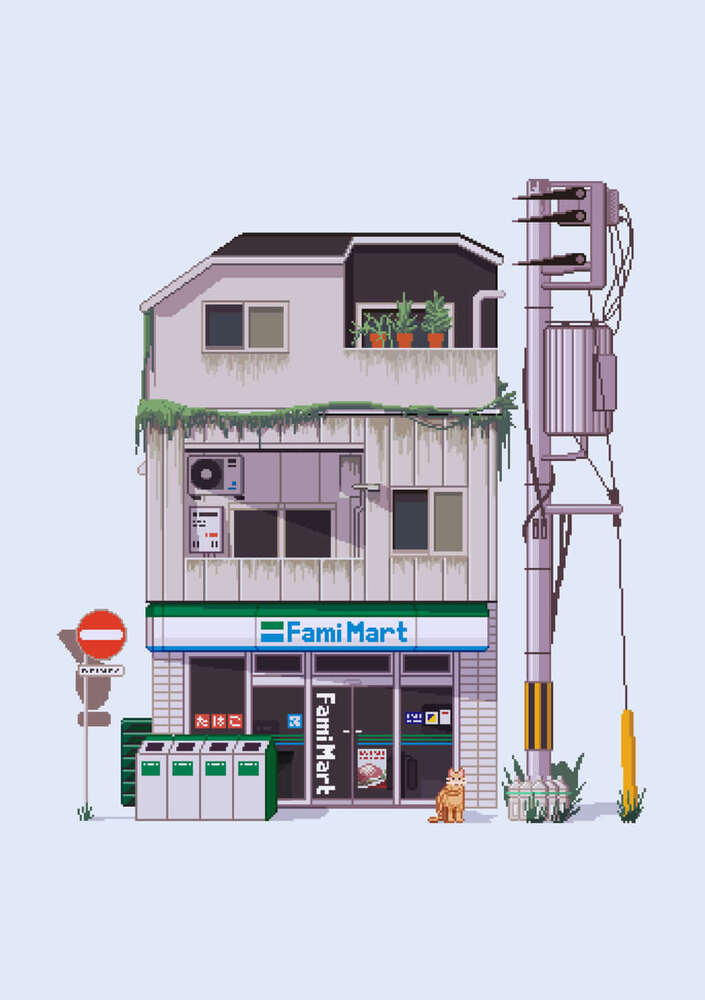 Nelson Wu’nun Japonya ile ilk karşılaşması 2019’da gerçekleşmiş. Environments serisini de o dönemde başlamış. Sanatçı, Tokyo sokaklarında dolaşırken Japon mimarisine ve özellikle de konbini’ye büyük bir ilgi duymaya başlamış. Bu yapıları piksel sanatıyla yeniden inşa etmeyi, yapboz parçalarını bir araya getirmeye benzetiyor sanatçı.