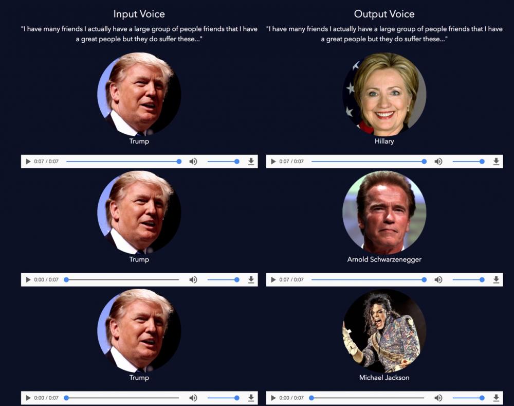 Derin öğrenme yöntemiyle geliştirilen NeuroVoice, sesten sese çeviri yaparak herhangi bir cümleyi başkasının ağzından çıkmış gibi aktarabiliyor. En yalın tabiriyle kendi söylediğiniz cümleleri alarak devlet başkanları veya popüler kültür ikonlarının ağzından -onların daha önce aynı kelimeleri kullanmasına gerek kalmadan- seslendirebiliyor. NeuroVoice’ın örneklerini internet sitesi üzerinden dinleyebilirsiniz.
