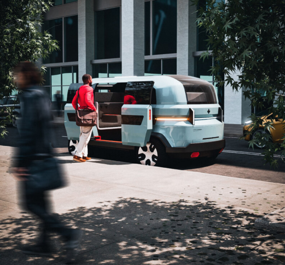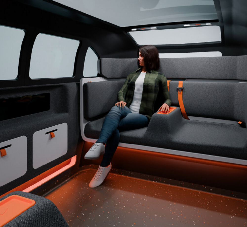 Modüler aracın kurulumu simetrik iki düzlemle değiştirilebiliyor. Kabin pürüzsüz, hatları yuvarlak bir dikdörtgen şekle sahip. Her iki tarafta iki tane olmak üzere toplamda dört koltuğu ve ortada da bol miktarda bacak mesafesi var. Bu alan aynı zamanda yolcuların yolculuk sırasında eşyalarını yanlarında bulundurmaları için geçici depolama alanı olarak da kullanılıyor. Dışarıda ise aracın kapılarında NFC teknolojisi bulunuyor. Gerekirse hoparlör gibi iç donanımlar da eklenebiliyor.