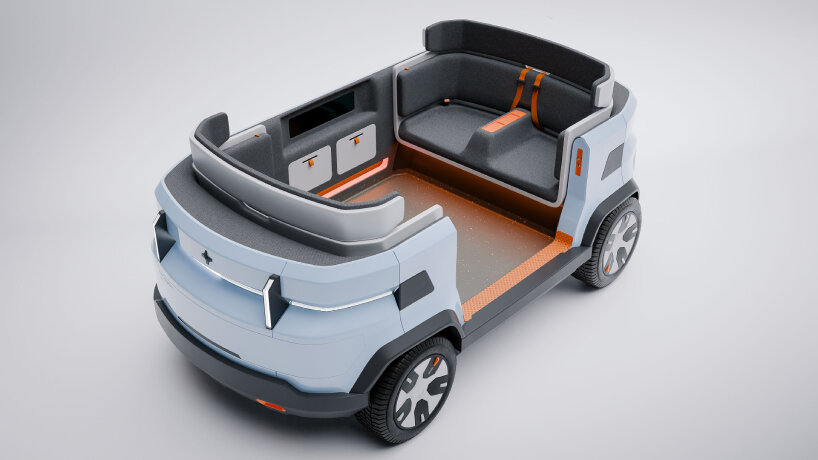 Modüler aracın kurulumu simetrik iki düzlemle değiştirilebiliyor. Kabin pürüzsüz, hatları yuvarlak bir dikdörtgen şekle sahip. Her iki tarafta iki tane olmak üzere toplamda dört koltuğu ve ortada da bol miktarda bacak mesafesi var. Bu alan aynı zamanda yolcuların yolculuk sırasında eşyalarını yanlarında bulundurmaları için geçici depolama alanı olarak da kullanılıyor. Dışarıda ise aracın kapılarında NFC teknolojisi bulunuyor. Gerekirse hoparlör gibi iç donanımlar da eklenebiliyor.