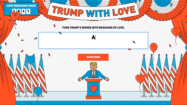 Trumpwith.love‘ın veritabanı ABD Başkanı’nın televizyon karşısında söylediği sözleri kesip, kelime kelime ayırarak hazırlanmış. Ortaya çıkan bu sözlükte yaklaşık 1.400 kelime yer alıyor. Bu kelimelerle sevgi ve dostluk dolu neler yazacağınız ise size kalmış. Şu ana kadar 15.130 mesaj oluşturulan platformda “Tek ihtiyacın sevgi.” veya “Bu muhteşem gezegende savaş olmasını istemiyorum.” gibi sevgi dolu cümleler kurgulanabiliyor. Bunlar Trumpwith.love ile yapılabileceklere sadece birer örnek, gerçek potansiyeli ise yaratıcılıkla açığa çıkacak.