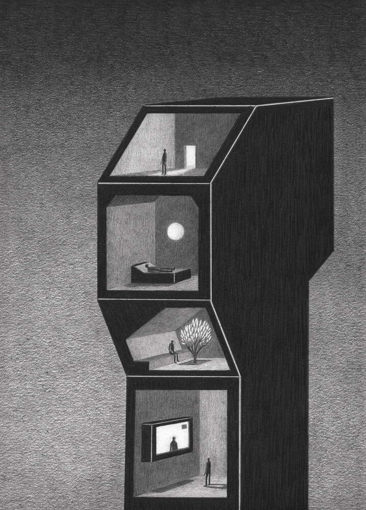 New Haven, Connecticut’ta yaşayan sanatçı; temelde kule gibi yüksek bilim kurgu yapıları çiziyor. Bu yapıların içinde ise fütüristik laboratuvarlar yer alıyor, uzaylılarla yaşanan çatışmalar ve çatılardan fırlayan devasa lazer ışınları, duvarların dev yaratıkların dokungaçlarıyla kırılması gibi ilginç olaylar yaşanıyor. En sık görülen sahneler de insanlar üzerinde yapılan deneyler. İçlerinde fırtınalar kopan bu mimariler, ışık ve gölge ile gizem ve bilinmezlik havasına büründürülmüş. Bu seri, sanatçının insanlarla bütünleşen ileri teknolojilere ve ilerlemenin dünyayı nasıl şekillendirdiğine olan ilgisinden doğmuş.