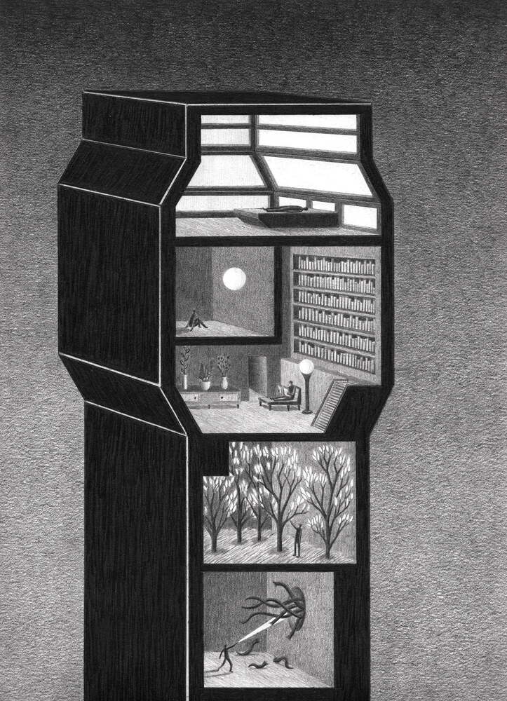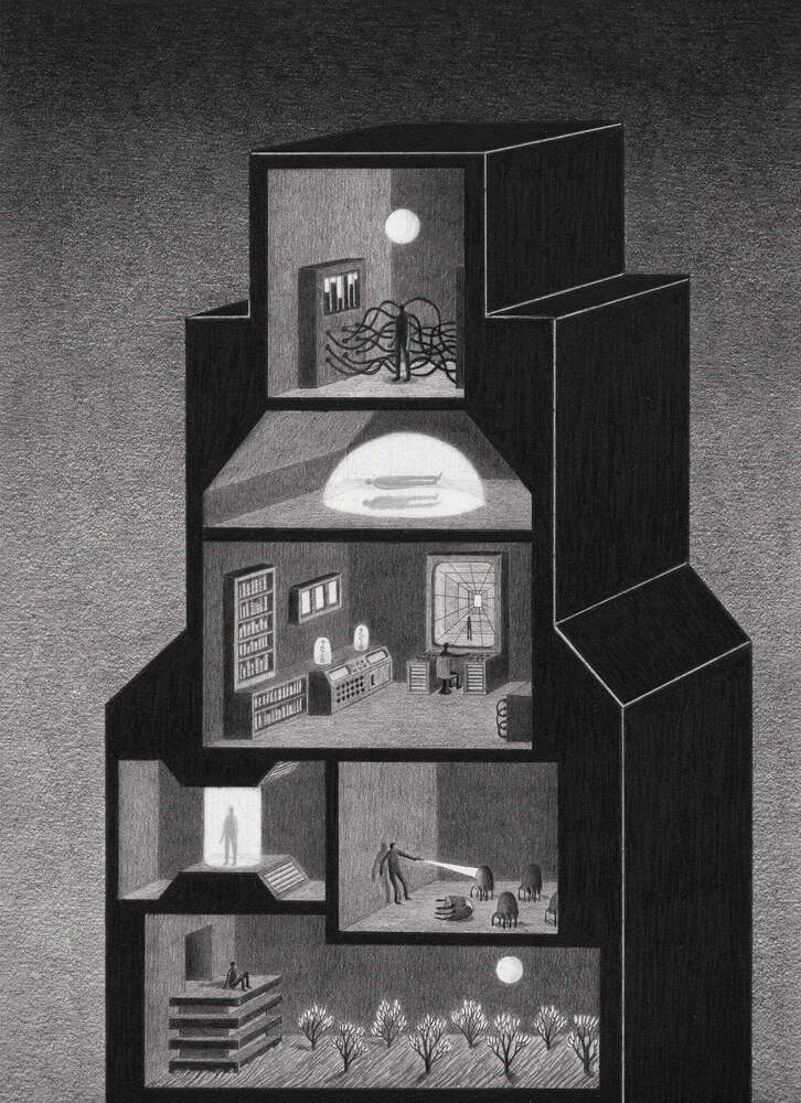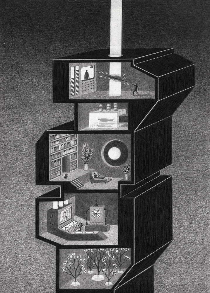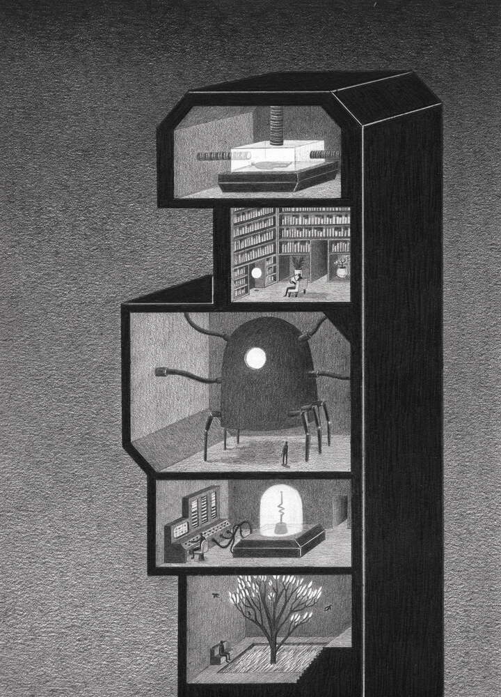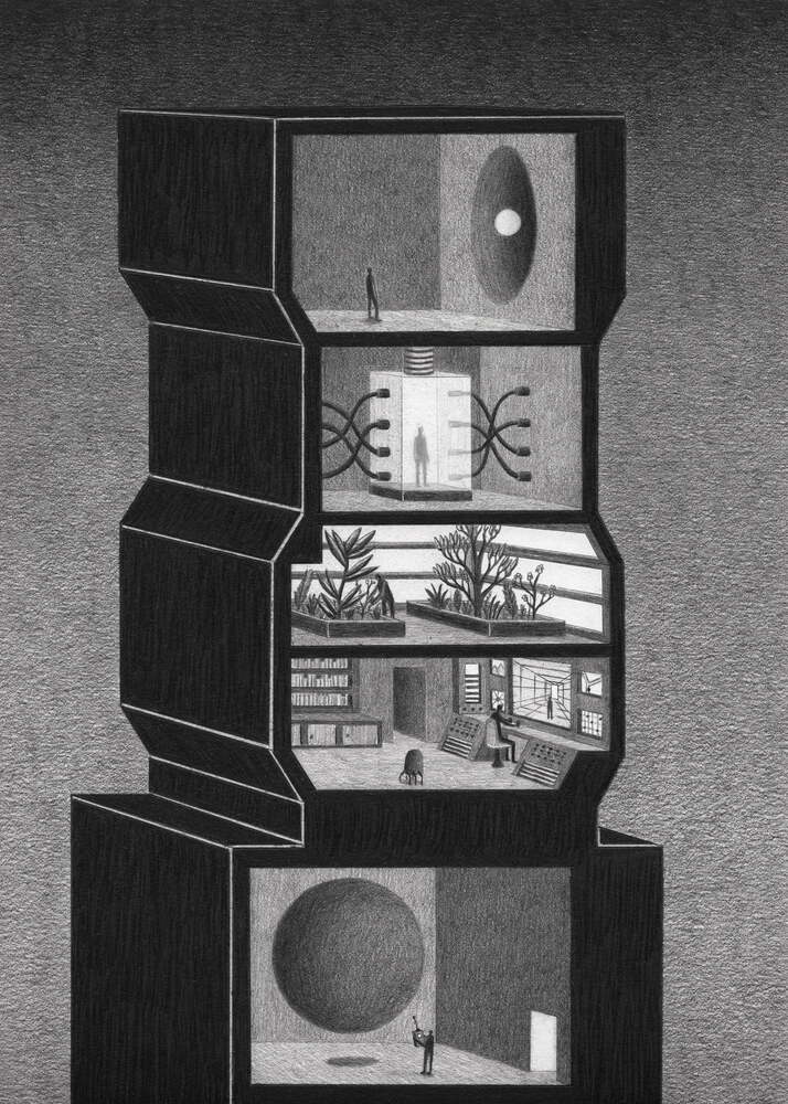 New Haven, Connecticut’ta yaşayan sanatçı; temelde kule gibi yüksek bilim kurgu yapıları çiziyor. Bu yapıların içinde ise fütüristik laboratuvarlar yer alıyor, uzaylılarla yaşanan çatışmalar ve çatılardan fırlayan devasa lazer ışınları, duvarların dev yaratıkların dokungaçlarıyla kırılması gibi ilginç olaylar yaşanıyor. En sık görülen sahneler de insanlar üzerinde yapılan deneyler. İçlerinde fırtınalar kopan bu mimariler, ışık ve gölge ile gizem ve bilinmezlik havasına büründürülmüş. Bu seri, sanatçının insanlarla bütünleşen ileri teknolojilere ve ilerlemenin dünyayı nasıl şekillendirdiğine olan ilgisinden doğmuş.