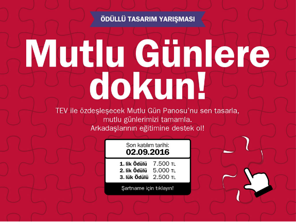 Bu hedeflerin gerçekleşmesi için de TEV bir tasarım yarışması başlattı ve Mutlu Gün Panosunu yenileme kararı aldı. Bu yarışmayla birlikte hem TEV’in öğrencilere hem de tasarımcılara destek olunacak. Yarışma hakkında detaylı bilgiyi buradan alabilirsiniz.