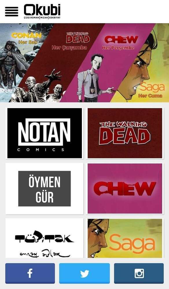 Şu anda Okubi üzerinde 8 yayıncı ve düzenli yayınlanan fasikülleri yer alıyor. Şu anda platform üzerinden The Walking Dead, Seyfettin Efendi ve Olağanüstü Maceraları, Conan, Saga, Tubitak, Chew, Gayesizler, Teşebbüs ve Noesis okunabiliyor. Mobil ve tarayıcı üzerinden okunabilen çizgi romanların bazıları başlangıç bölümleri ücretsiz yayınlıyor. Ancak genel olarak fasikül başına 1 ile 3 kredilik satın alma talep ediliyor. Toplu kredi satın almalarda 10+1, 20+2, 50+6 gibi avantajlar olsa da 1 kredinin 1 Türk Lirasına eşit olduğunu düşünmek mümkün.