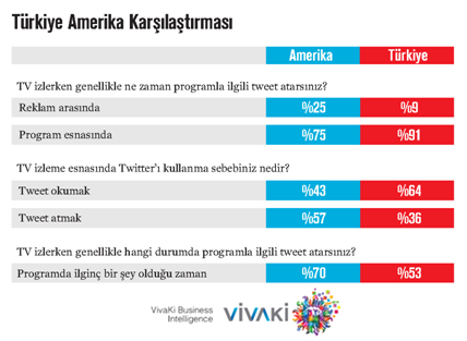 Vivaki’nin derlediği bilgilere göre Türkiye ve Amerika Birleşik Devletleri’ndeki seyircilerin davranış profilleri kıyaslandığında birçok orantısızlık göze çarpıyor. Televizyon izlerken ABD vatandaşları tweet atmayı tercih ederken, burada daha çok okuma yapılıyor. İkinci ekran yardımıyla içerik üreten yerine tüketen tarafta olmamızın da olumlu ve olumsuz sonuçları da bulunuyor.
