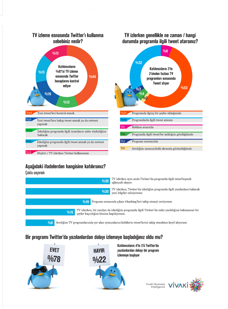 Program sırasında ilginç bir şey olması ise izleyicileri tweet atmaya yönelten en büyük motivasyon. Turkey Twitter Survey (Nisan 2014) araştırmasını derleyen Vivaki’nin infografiğine göre Türkiye’nin %53’ü, ABD’nin %70’i ilginç bir durumla karşılaşınca sosyal medyaya yöneliyor.