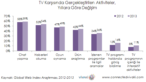 Global Web Index araştırmasının 2011 ve 2013 yıllarındaki değişimi anlamlandırdığı çalışmasında televizyon başında geçirilen süre ve pasif izleyicilik zaman içerisinde azalıyor. Çoklu işlem yaparak televizyon izlerken teknolojik cihaz kullanma oranları da yıllara göre artış gösteriyor.