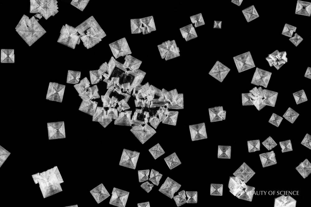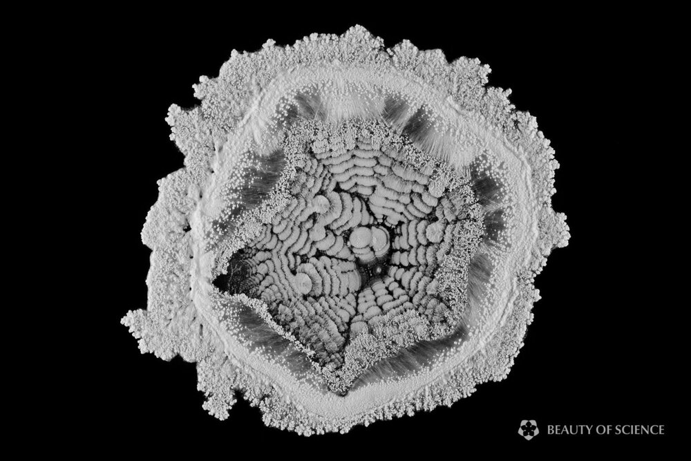 Potasyum nitrat ve sodyum sülfat içeren tuzlardan oluşan kristaller, havai fişek patlamalarına benzer şekilde yayılarak görünür oluyor veya suyun donma sürecindekine benzer motifler yaratıyor.