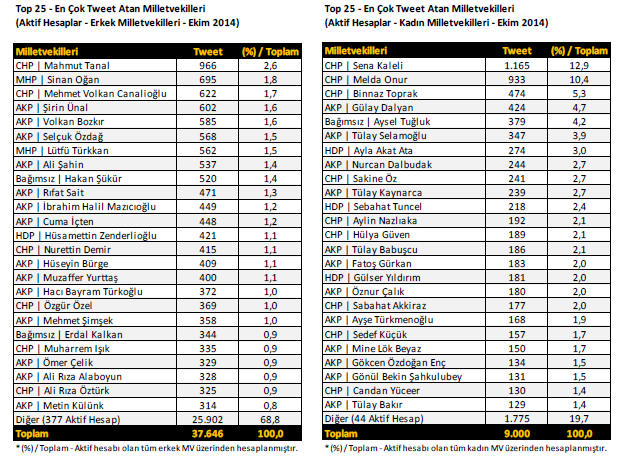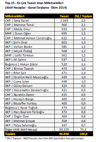 – 536 milletvekilinin 472’si aktif kullanıcı ve üç milletvekili ise Twitter hesaplarını çeşitli nedenlerle pasif hale getirmiş. Ekim ayı itibariyle halen TBMM’de görev yapmakta olan 61 milletvekilinin de Twitter hesabı bulunmuyor.
