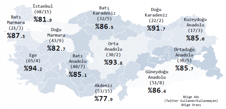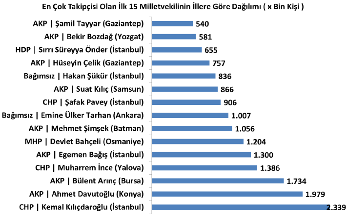 – Twitter hesabı olan milletvekillerine il bazında bakıldığında üç büyük şehir (İstanbul 68, Ankara 29, İzmir 24) ön plana çıkıyor. İkişer milletvekiline sahip Bilecik, Karaman, Karabük ve Kilis’in sadece birer vekilinin Twitter hesabı varmış.