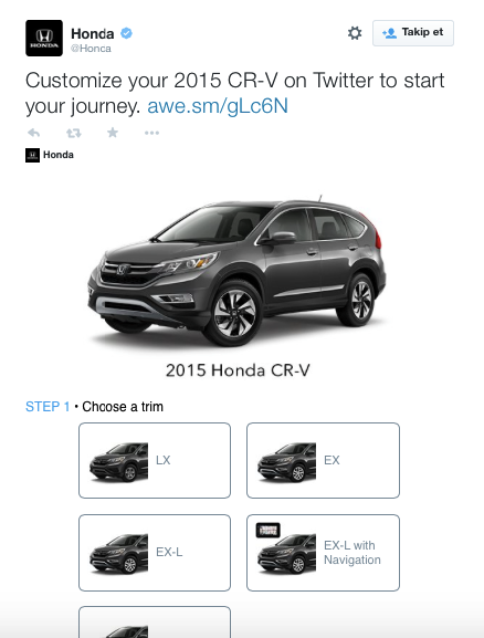 Tweet içine gömdüğü seçeneklerle arabayı istediğiniz gibi yapılandırmanıza izin veren marka, tweet üzerinden üç seçeneği size sunuyor.