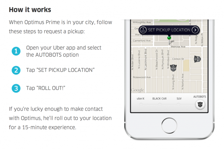 Uber, geçtiğimiz hafta gösterime giren Transformers – Kayıp Çağ (Age of Extinction) filminin tanıtımı kapsamında kendi iletişimine de müthiş katkı sağlayacak bir proje gerçekleştirdi. Sırasıyla Dallas, Phoneix ve Los Angeles’ta birer günlüğüne Uber uygulaması üzerinden Optimus Prime’ı çağırma olanağı veren şirket, bunun için uygulama içine çağırılacak araçlara “Autobots” bölümünü ekledi.