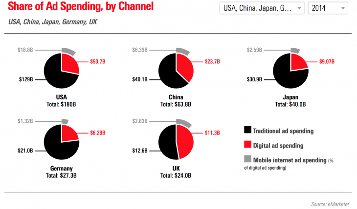 Birleşik Krallık tüm medyada 24 milyar dolar, dijitalde 11,3 milyar dolar ve mobil internette 2,83 milyar dolar harcamış. Japonya için bu veri; tüm medyada 40 milyar dolar, dijitalde 9,07 milyar dolar ve mobil internette 2,59 milyar dolar iken Almanya’daki harcama verileri tüm medya için 27,3 milyar dolar, dijitalde 6,29 milyar dolar, mobil internette ise 1,32 milyar dolar.