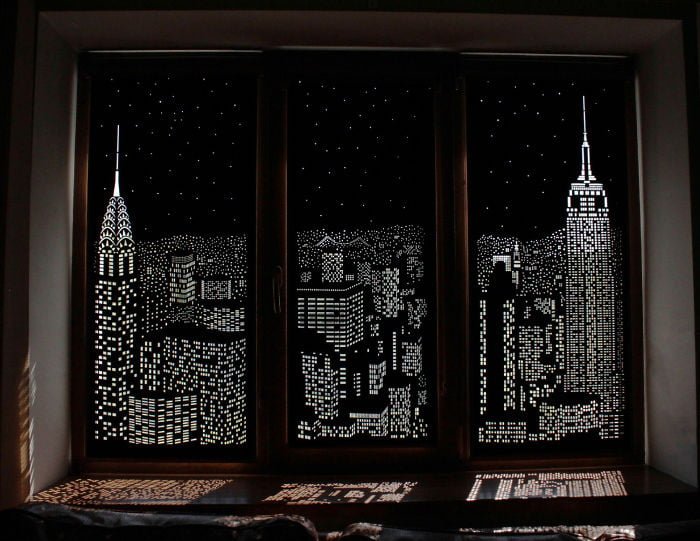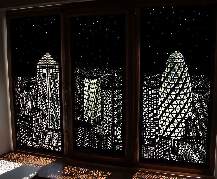 Ukraynalı tasarımcı ekibi HoleRoll, karartma perdelerinin desenlerindeki küçücük detaylarla herhangi bir pencereyi gösterişli bir New York ya da Londra esintili şehir silüetine dönüştürebilen, eve minimum ışık girmesini sağlayan, tasarımlarıyla dikkat çekiyor. Tasarımlarıyla gün ışığında ünlü şehirleri gece manzaralarını yaratmayı başarmışlar.