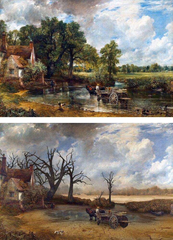 Örneğin; John Constable’ın yukarıdaki The Hay Wain (Saman arabası, 1821) isimli tablosu bu yaz Avrupa’nın çoğunun rekor sıcaklıklara maruz kalışını tasvir etmek üzere yeniden yorumlanmış. Bu yeni versiyonda, bir zamanlar bereketli olan nehir kıyısı manzarası artık çoraklaşmış ve geride sadece kavrulmuş toprak kalmış. Sir John Everett Millais’in Ophelia’sının (1851 – 1852) yeniden yorumlanmış versiyonu ise ünlü Shakespeare karakterini kirli bir derede; plastik poşetlerin, plastik şişelerin ve maskelerin arasında gösteriyor.