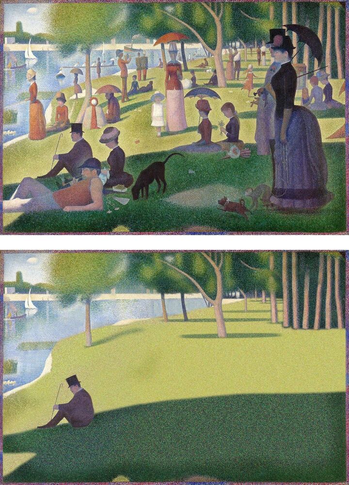 Dünyanın çoğu bölgesinde somut ya da önemli bir sorun olarak ele alınmasa da yalnızlık salgını bu serinin önemli bir parçası olmuş. Georges Seurat’nın aşağıdaki A Sunday On La Grande Jatte (Grande Jatte Adası’nda Bir Pazar Öğleden Sonrası, 1884) adlı eserinin yeniden tasarlanmış versiyonu, kalabalıktan uzakta, tek başına sessizce oturan bir kişiyi tasvir ederek bu konuyu ele alıyor.
