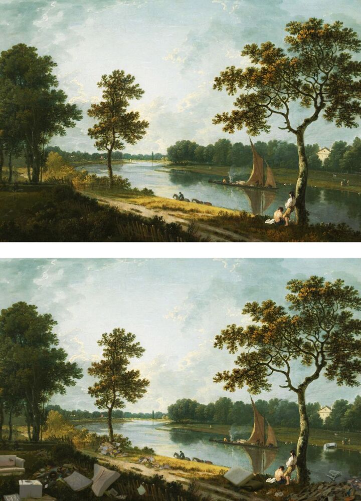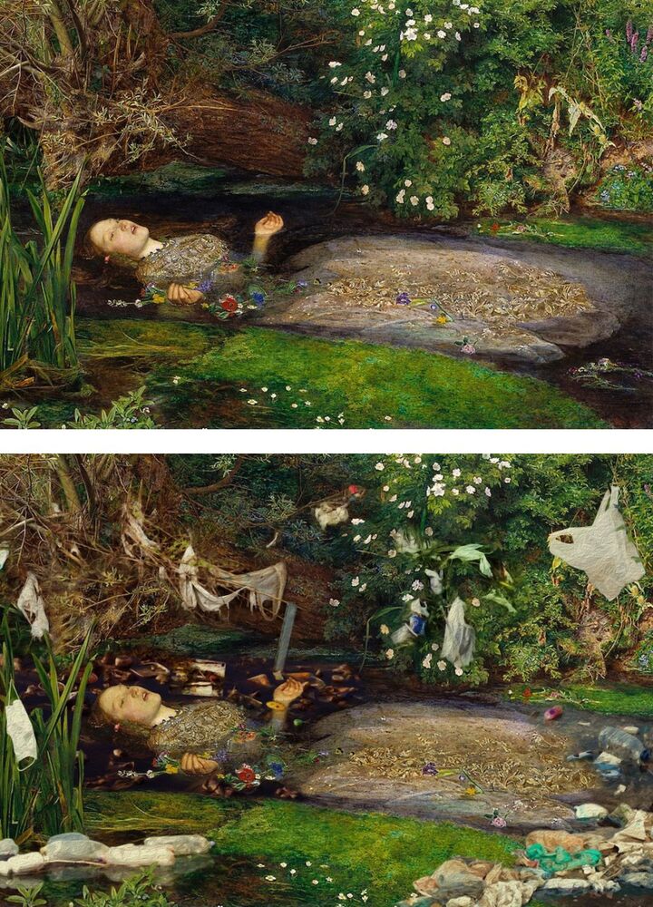 Örneğin; John Constable’ın yukarıdaki The Hay Wain (Saman arabası, 1821) isimli tablosu bu yaz Avrupa’nın çoğunun rekor sıcaklıklara maruz kalışını tasvir etmek üzere yeniden yorumlanmış. Bu yeni versiyonda, bir zamanlar bereketli olan nehir kıyısı manzarası artık çoraklaşmış ve geride sadece kavrulmuş toprak kalmış. Sir John Everett Millais’in Ophelia’sının (1851 – 1852) yeniden yorumlanmış versiyonu ise ünlü Shakespeare karakterini kirli bir derede; plastik poşetlerin, plastik şişelerin ve maskelerin arasında gösteriyor.