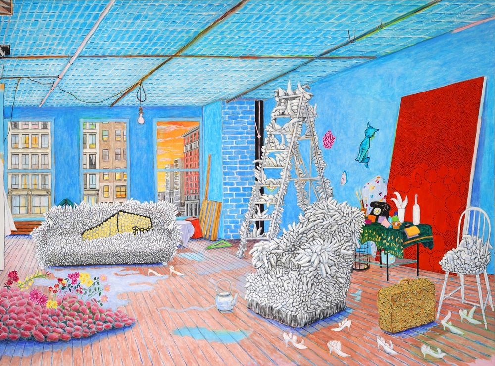 Büyük ölçekli resimlerinde; raflardaki süs eşyaları, hazır sanat malzemeleri ve hala şövale üzerinde duran ünlü eserler dahil her şey eksiksiz görünüyor. Örneğin Francis Bacon’un stüdyosunun oldukça dağınık olduğunu ve Keith Haring’in çatı katı stüdyosunun grafiti ve eskizlerle kaplı olduğunu görebiliyoruz. Yayoi Kusama’nın 1960’larda New York’ta bulunan stüdyosunun ise üç boyutlu tekstil heykelleriyle dolu sürükleyici bir deneyim/sergi alanına dönüştüğü görülüyor.