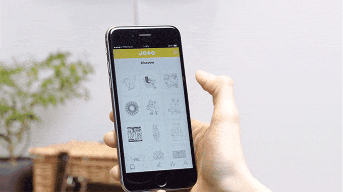 Joto’nun bilgisayar veya mobil cihazlar üzerinde çalışan özel uygulaması ile kendiniz çiziktirebiliyor (“jot”layabiliyor), başkalarının yaptıklarını görebiliyor, kendinizinkini paylaşabiliyorsunuz. Böylece bir Joto topluluğu oluşmuş oluyor. Dilerseniz topluluk içindeki yetenekli çizerlerin elinden çıkma çizimleri Joto aracılığıyla duvarlarınızda sergileyebiliyorsunuz.