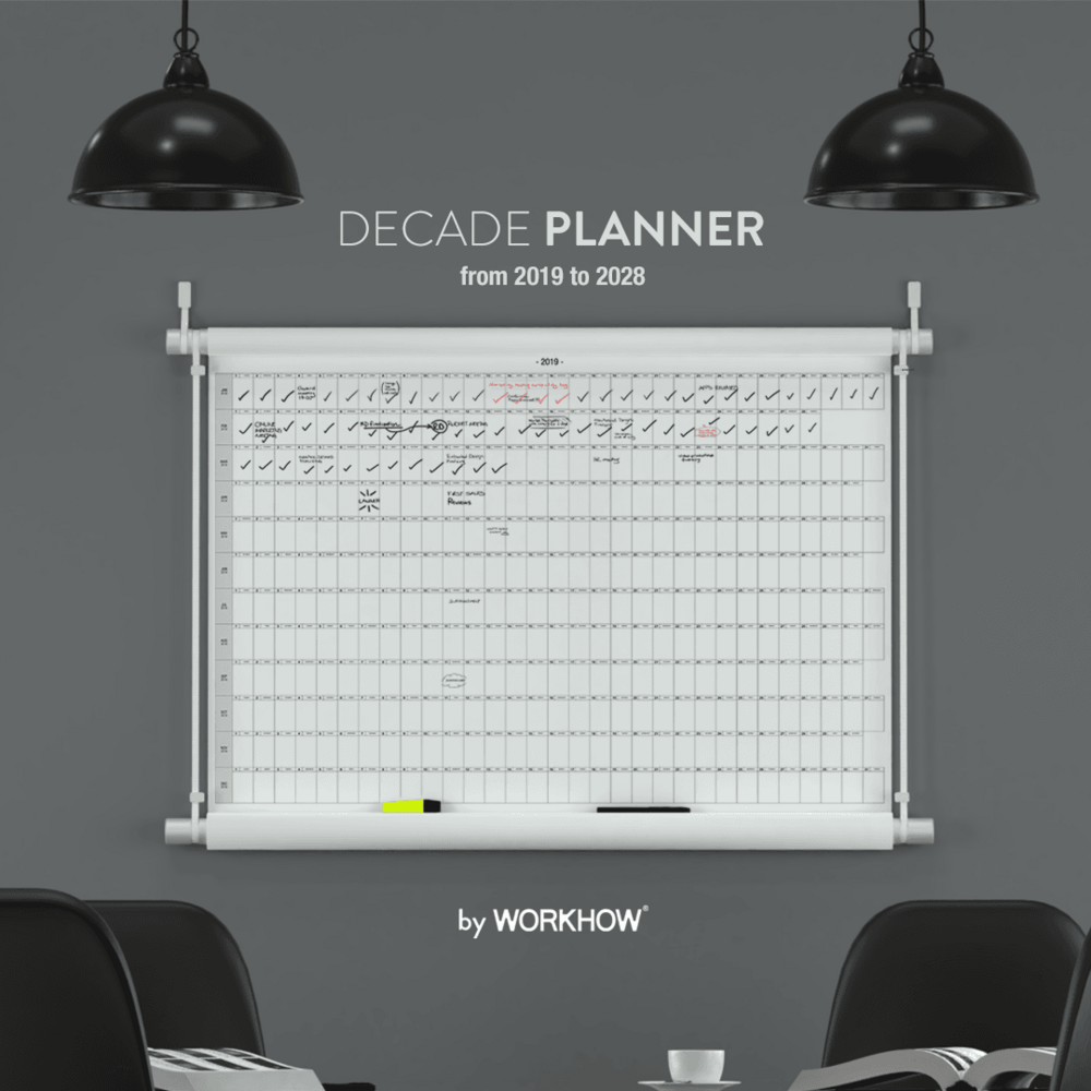 Decade Planner, 10 yıllık bir süreci planlayabileceğiniz şık bir duvar takvimi. Bu orijinal tasarım, geçmişteki bir olaya kolayca geri dönüp göz atmaya veya gelecekteki özel bir tarihi planlamaya olanak sağlıyor.