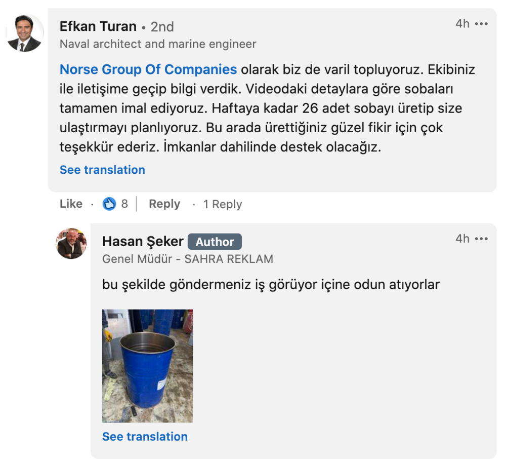 Paylaşımlara gelen yorumlarda, başka şirketlerin de bu ileri dönüşüm fikri üzerine harekete geçmeye başladığı görülüyor. Varil toplamaya başlayanlar, videodaki detaylara göre sobaları imal etmeye başladıklarını ve en kısa zamanda bölgeye ulaştıracaklarını belirterek Sahra Reklam’a teşekkür ediyor.