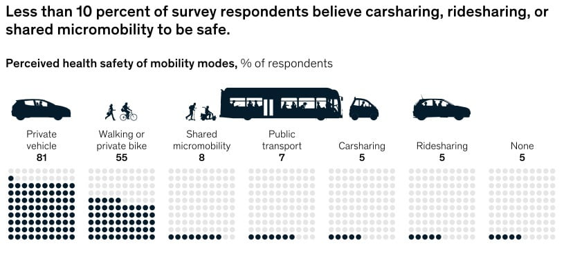 Çocuğu olsun veya olmasın herkes için ortak sorun işe gidip gelmek oldu. McKinsey & Company’nin mayıs tüketici anketinde büyük oranda insanların özel araçlarıyla işe gidip gelmeyi tercih ettikleri görülüyor. Mikro mobilete çözümleri ise araç paylaşımdan ve toplu taşıma kullanımından daha çok tercih ediliyor.