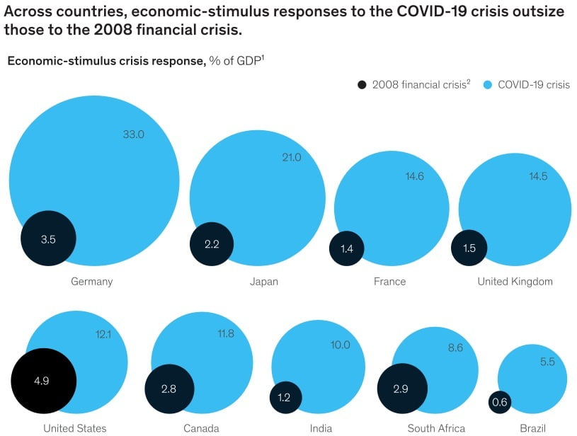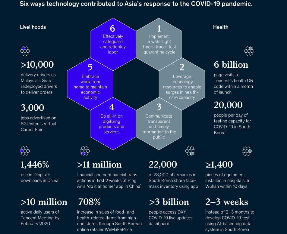Asya ülkeleri karantina altına giren ilk yerler olurken bu ülkelerin dijital dönüşümü diğer ülkelerin ekonomik sıkıntıları öngörmesi ve çözüm üretmesi için yardımcı oldu. Hükümetler karantina sürecinin ekonomiye büyük etki yapacağını fark edince ekonomik teşvik paketlerini hızla devreye soktu ve küresel ölçekte 10 trilyon dolar ayırdı. Bu 2009 yılında yaşanan mali krizdeki yardımların üç katına denk geliyor.