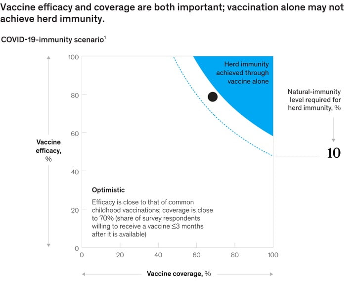 Kuzey Yarım Küre nüfusunun daha fazla olması sebebiyle COVID-19 testi talebinin dönemsel olarak artacağı tahmin edildi. Virüsün kış aylarında daha aktif olması sebebiyle Kuzey Yarım Küre kış mevsimine girdiği zaman virüsün yayılma hızı da artış gösteriyor. Bununla birlikte yine aynı dönemde grip hastalığının artması ve semptomlarının COVID-19 semptomlarına benzemesi test ihtiyacının neden daha fazla olabileciğinin açıklaması oldu. Ancak dünya aşı çalışmalarının da olumlu sonuç vermesiyle yılı rahat bir nefes alarak kapatıyor. Tabii aşılamanın uygulanma ölçeği bir sonraki sorunu getiriyor. McKinsey & Company, son tablosuyla ABD için popülasyonun ne kadarı aşılanırsa etkili olacağını paylaşıyor.