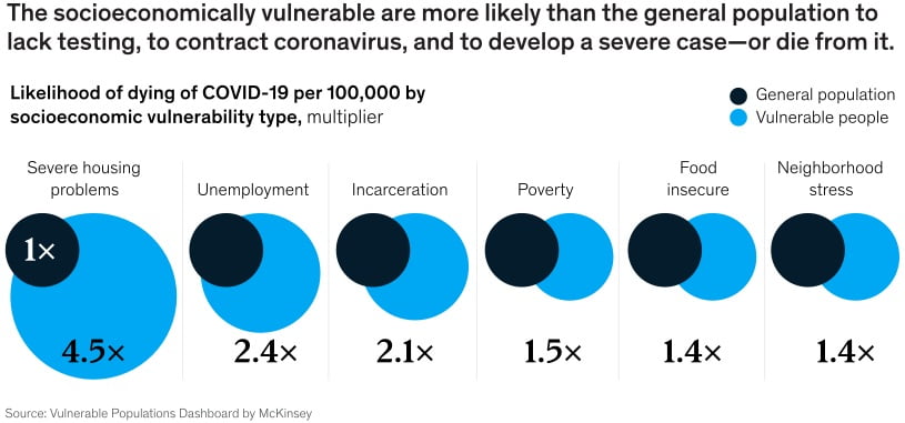 COVID-19 vakalarının ilk zamanlarında bulaşma ve ölüm oranları herkes için büyük bir endişeyken süre geçtikçe bu durumun kişiler arasında eşit olmayan etkilere sahip olduğu görüldü. Süreç ilerledikçe virüsün yayılımının sosyoekonomik etkilere göre değişim gösterdiği ortaya çıkarken işsiz veya düşük gelirli olan, barınma sorunu yaşayan kişiler virüse karşı daha savunmasız kaldı. Ayrıca virüsün azınlık topluluklarını da sert bir şekilde etkilediği hızla ortaya çıktı.
